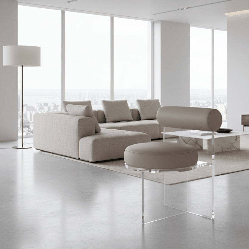 Bring a modern statement into your home with this sculptural acrylic stool. The crystal-clear base creates a light, floating look. Perfect beside a vanity, tucked into a bedroom corner, or styled as an accent piece, it adds a refined touch without overwhelming your space.