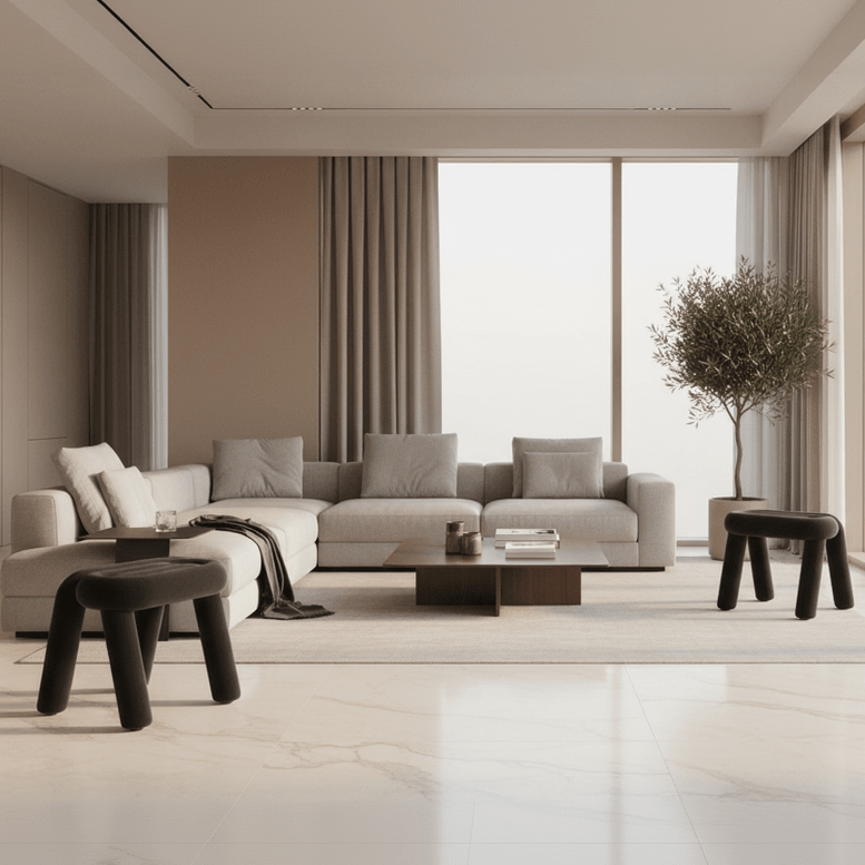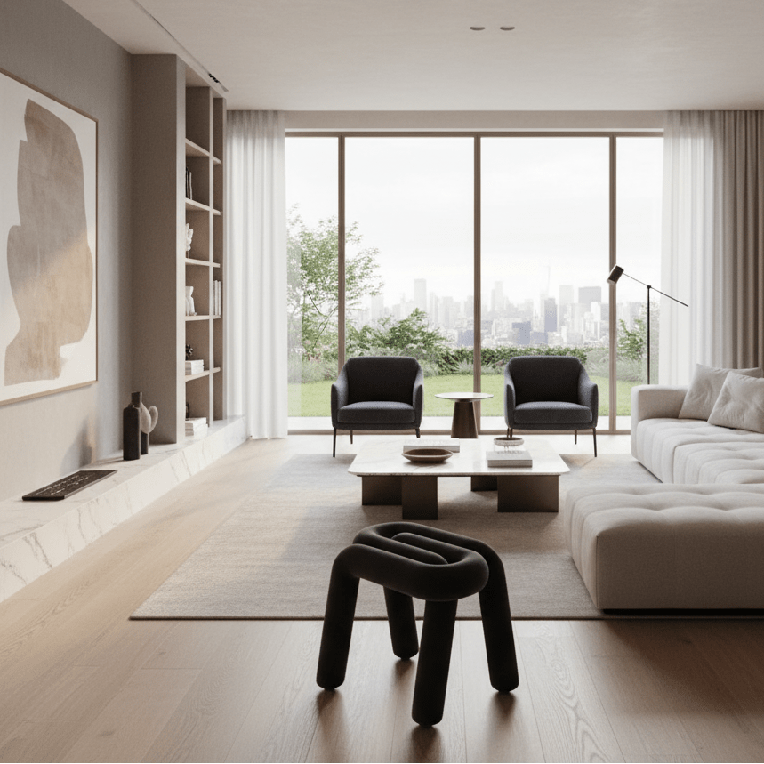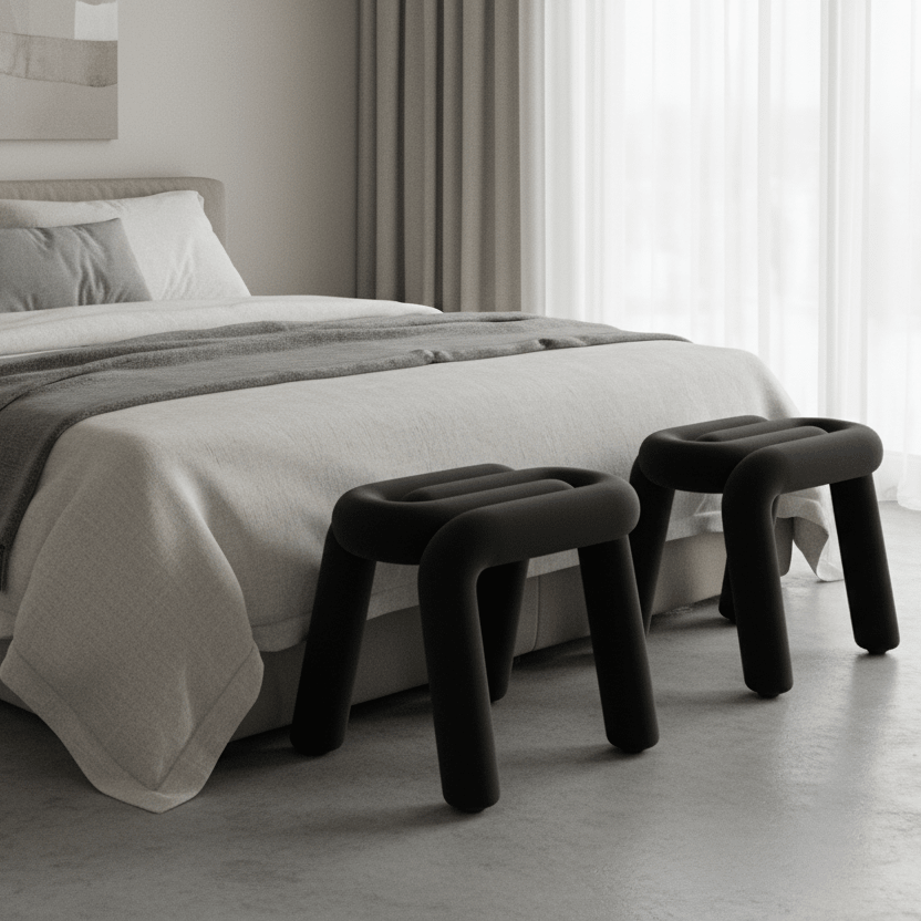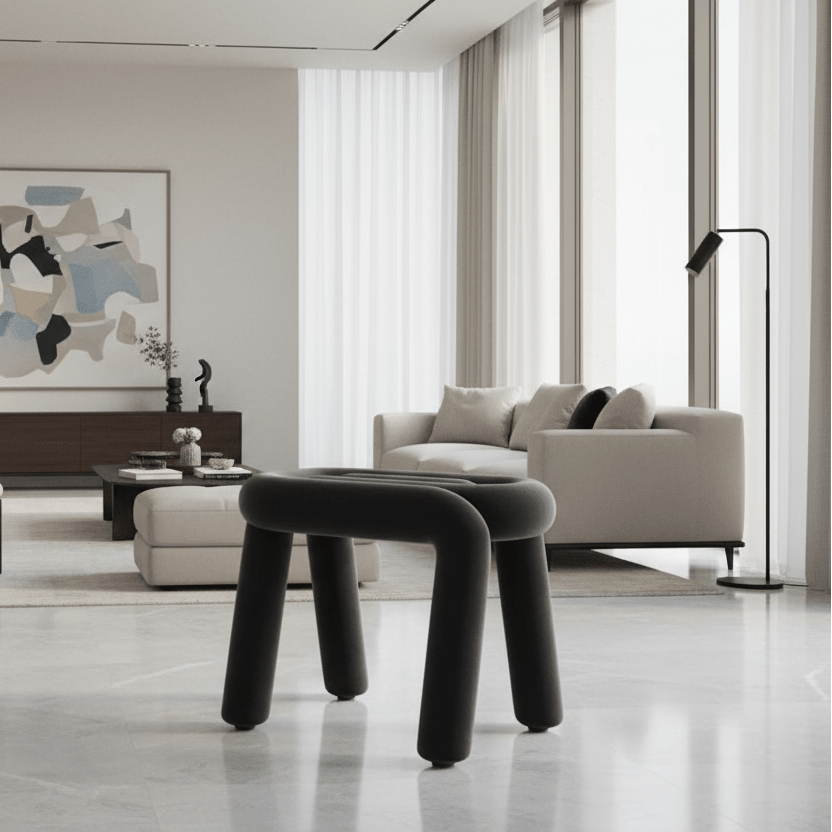 Meet the stool that steals the spotlight: A sculptural piece featuring an interwoven carbon steel frame design that commands attention in any room. The thick-pipe silhouette creates visual interest while the soft velvet upholstery provides comfort and softness.