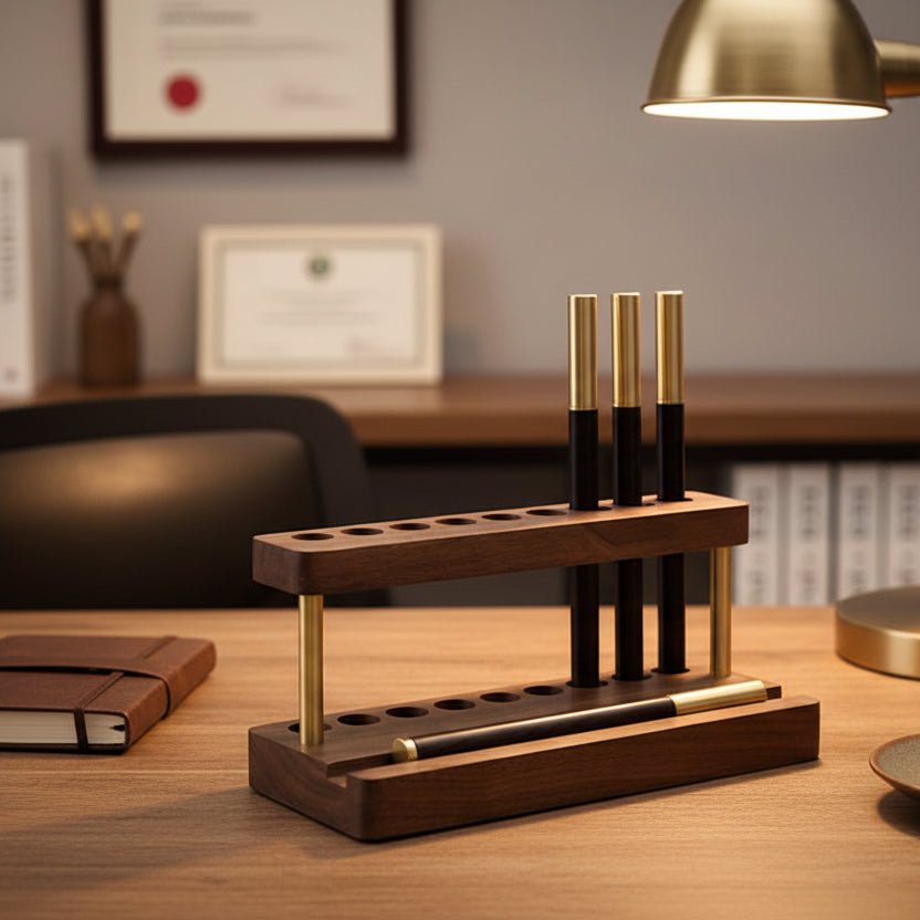 Your desk just got a stylish upgrade. This wooden pen holder combines smart storage with everyday convenience—multiple slots keep pens, and pencils neatly arranged, while a dedicated slot holds your phone.