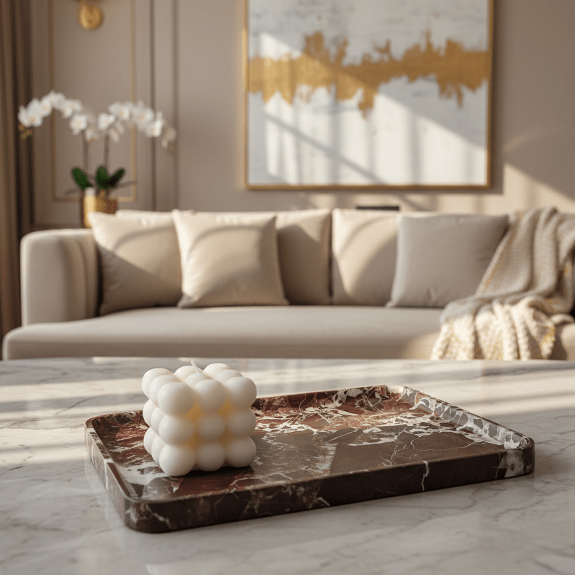 The Amaranthe Marble Tray embodies refined elegance through its striking dark purple-red marble composition. This sophisticated tray transcends conventional storage, serving as a versatile design element for jewelry, candle displays, desk arrangement, and accessories.