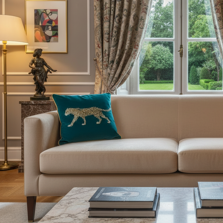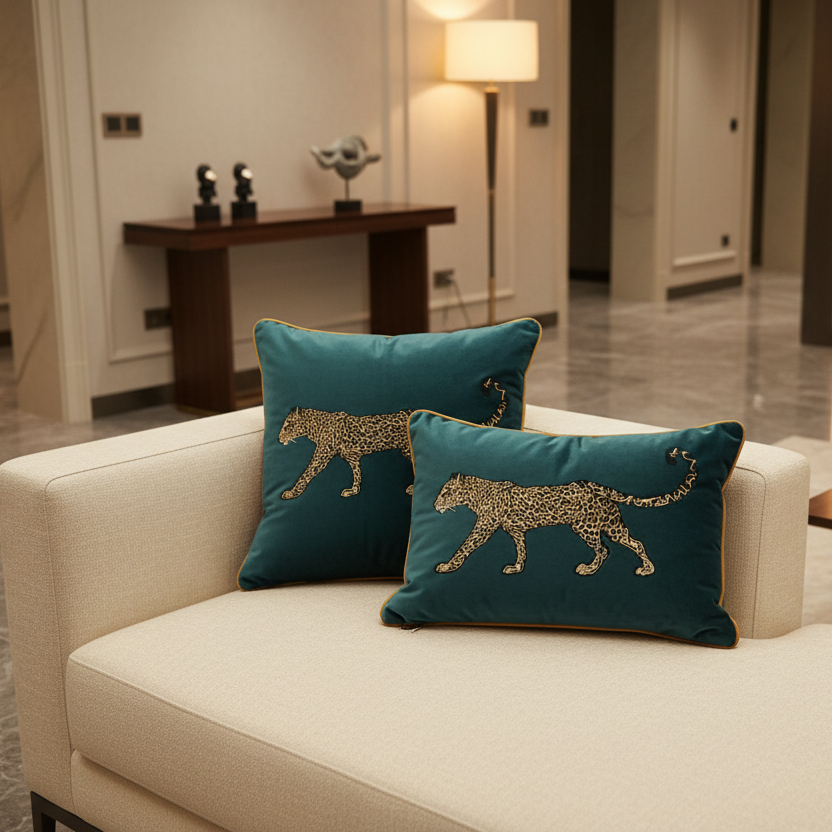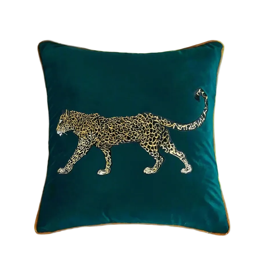 Indulge in opulence with our Feline Majesty green velvet pillow covers. Adorned with an eye-catching embroidered leopard, these luxury pillows are sure to add class and elegance to any room.