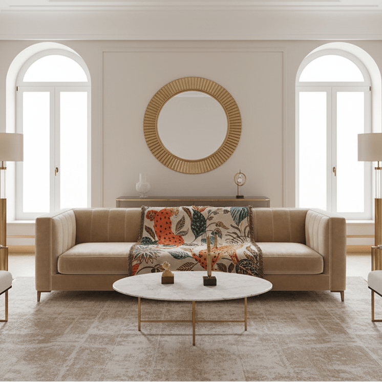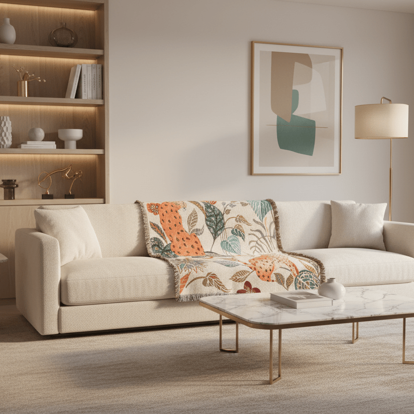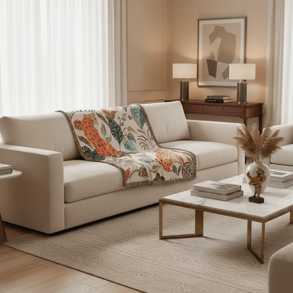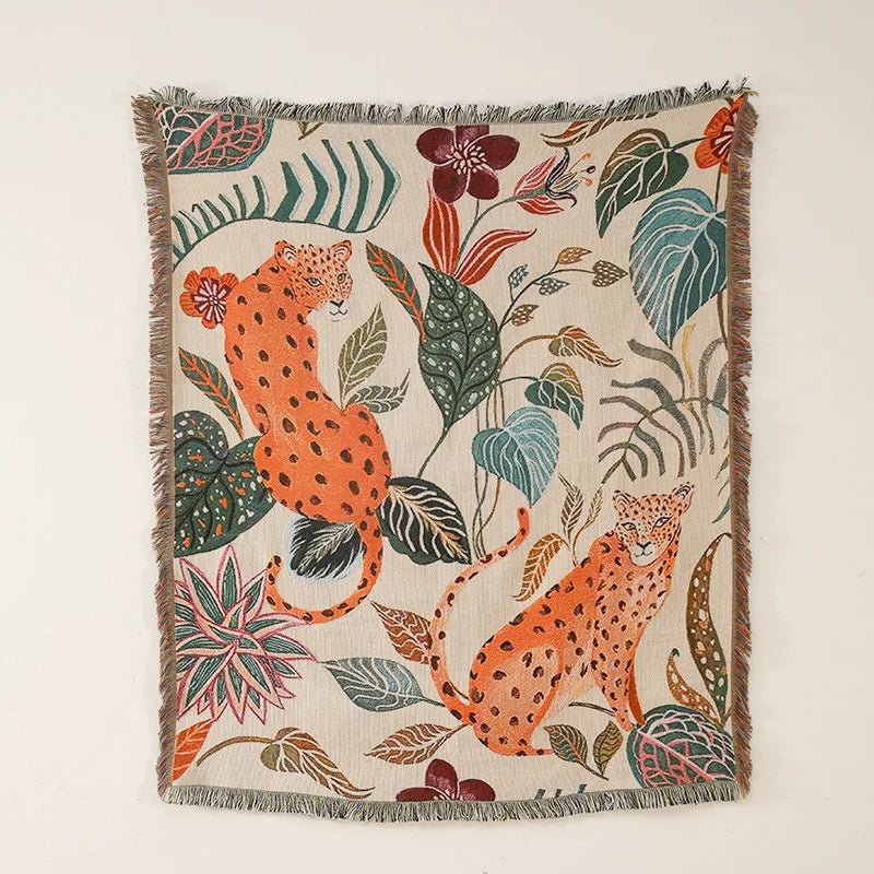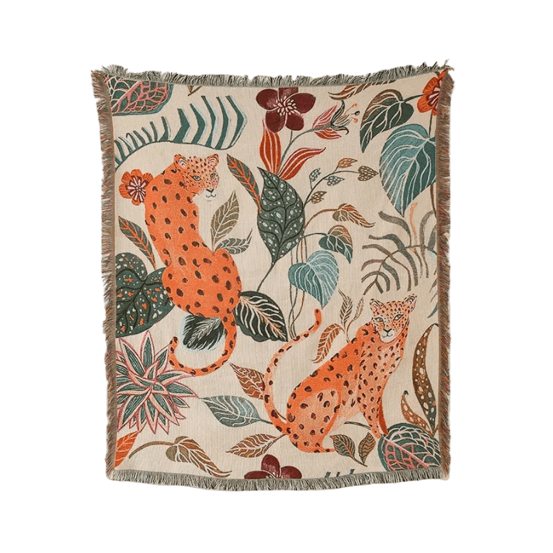 An artful expression of modern luxury, this blanket transforms the wild into something quietly elegant. Illustrated leopards move through a tapestry of lush botanicals, where rich terracotta tones meet deep greens and soft neutrals. The composition feels both exotic and composed—bold in detail, serene in balance.