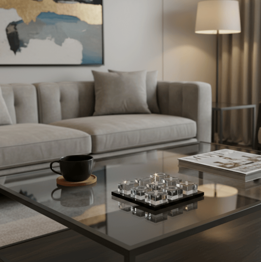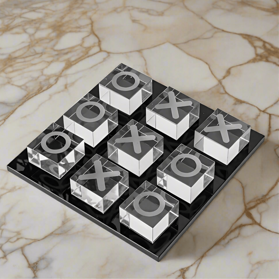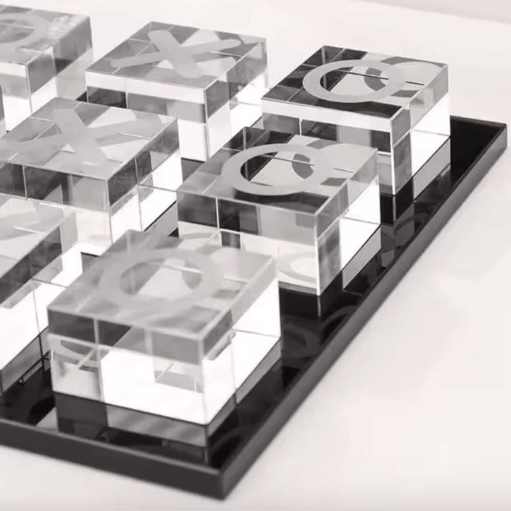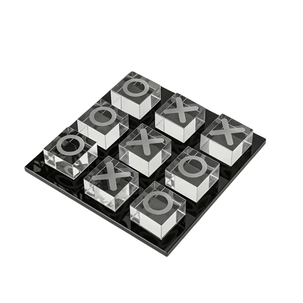 For those who play to impress. Make your mark with the Glass XO Set, featuring a sleek black glass base and clear glass cubes for Xs and Os. This daring design adds a sharp, modern edge to the classic tic tac toe game. Don’t settle for ordinary, choose to play boldly.